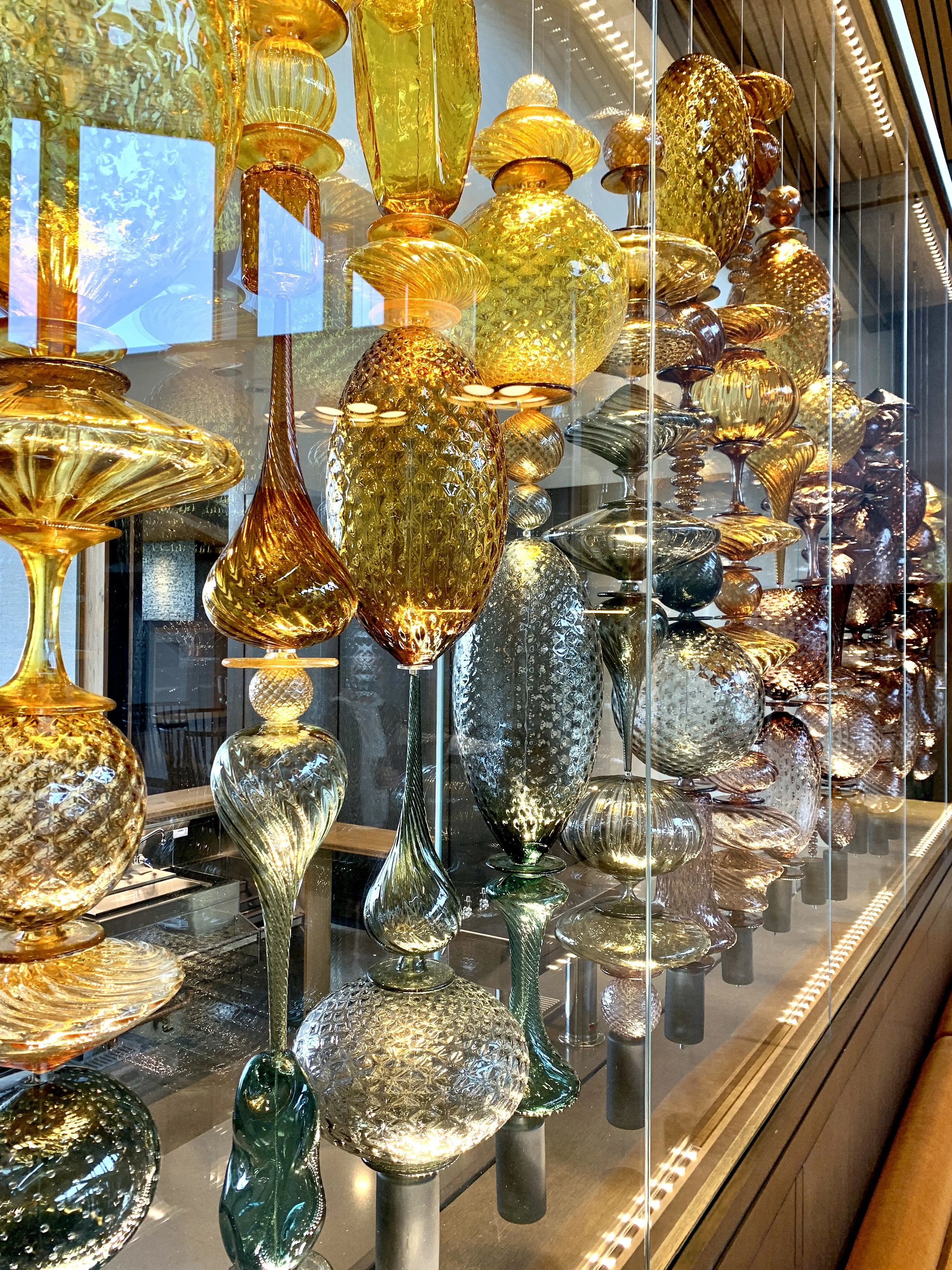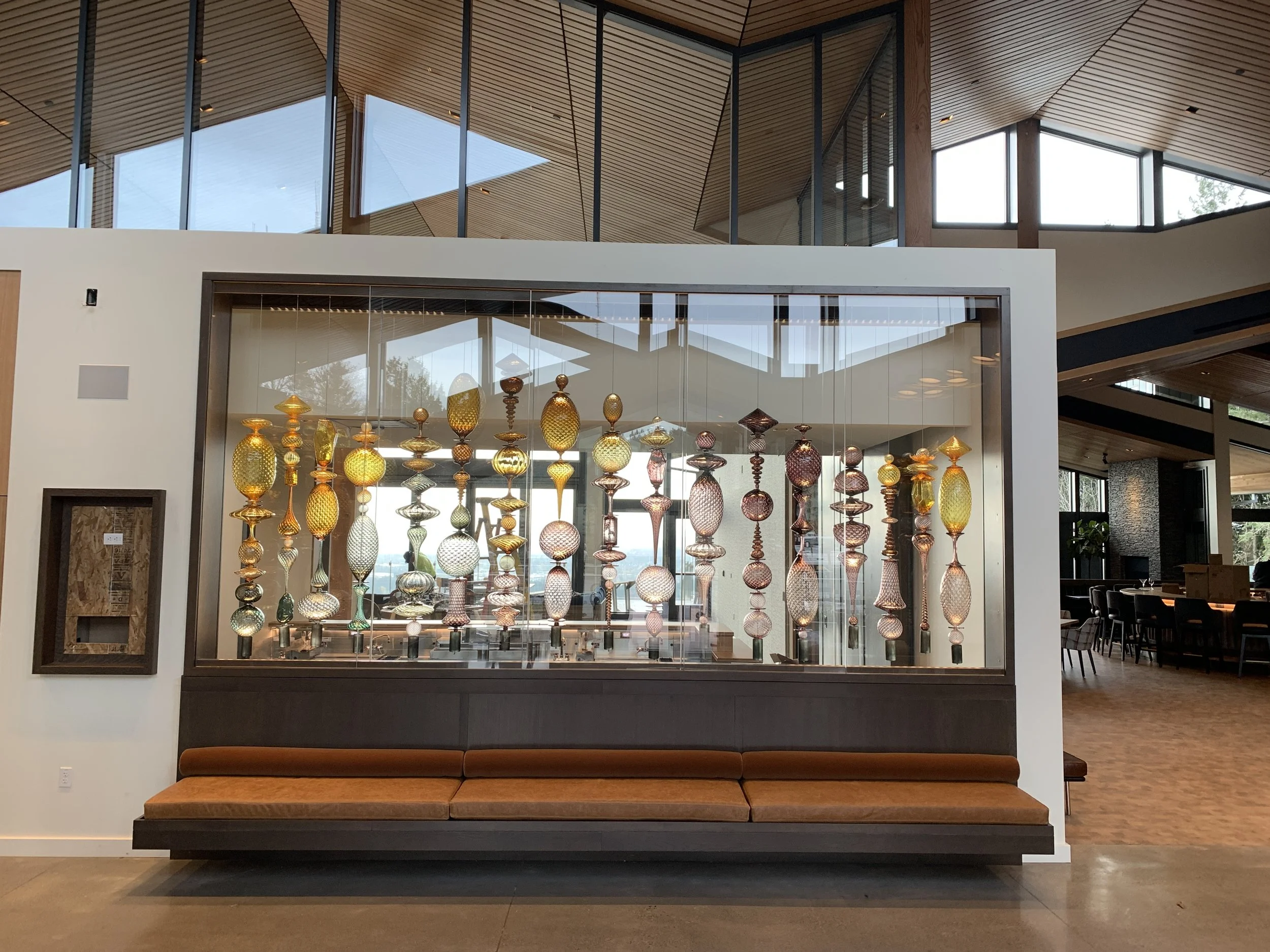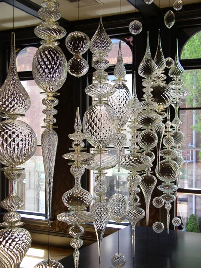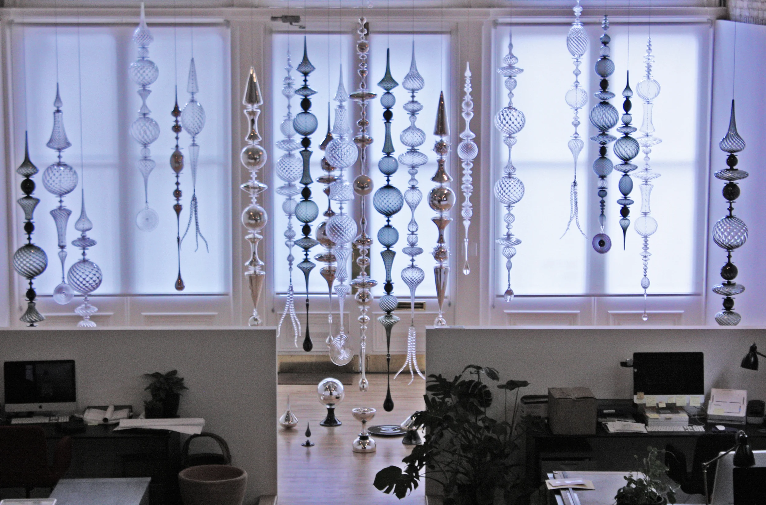 “Optic Twist Screen #1” was also designed in collaboration with Portland, Oregon-based interior designer Jessica Helgerson for the historical Bishop’s House downtown where it is permanently installed. The piece is made up of over 100 various blown shapes strung on steel cable, to provide a visually and acoustically permeable space divider. The project was featured in Gray Magazine and Milk Decoration.