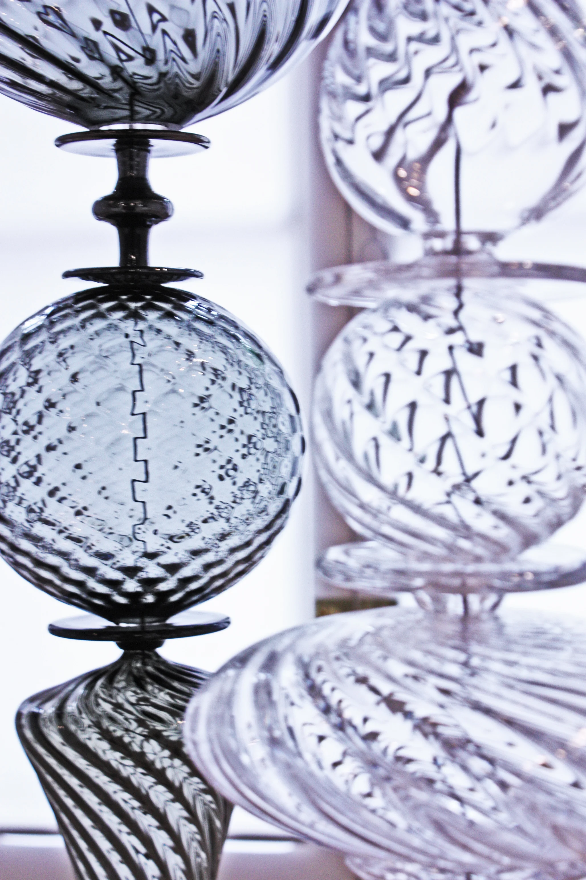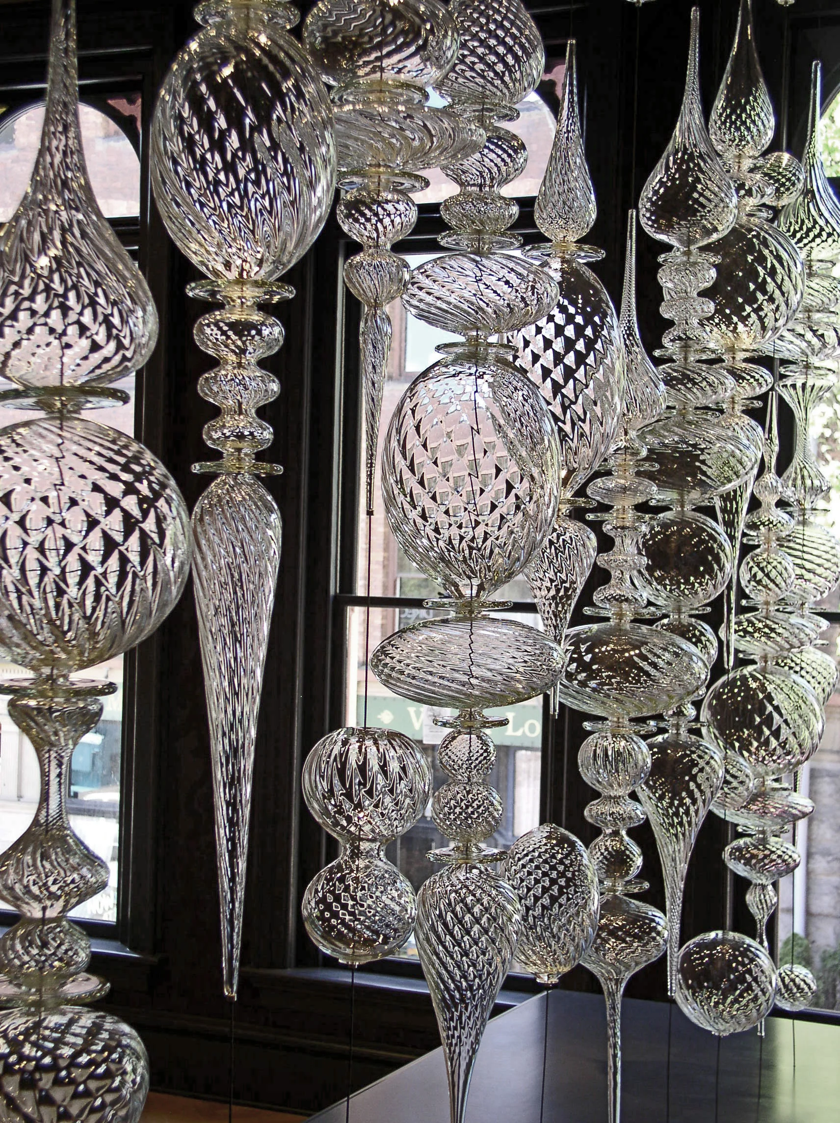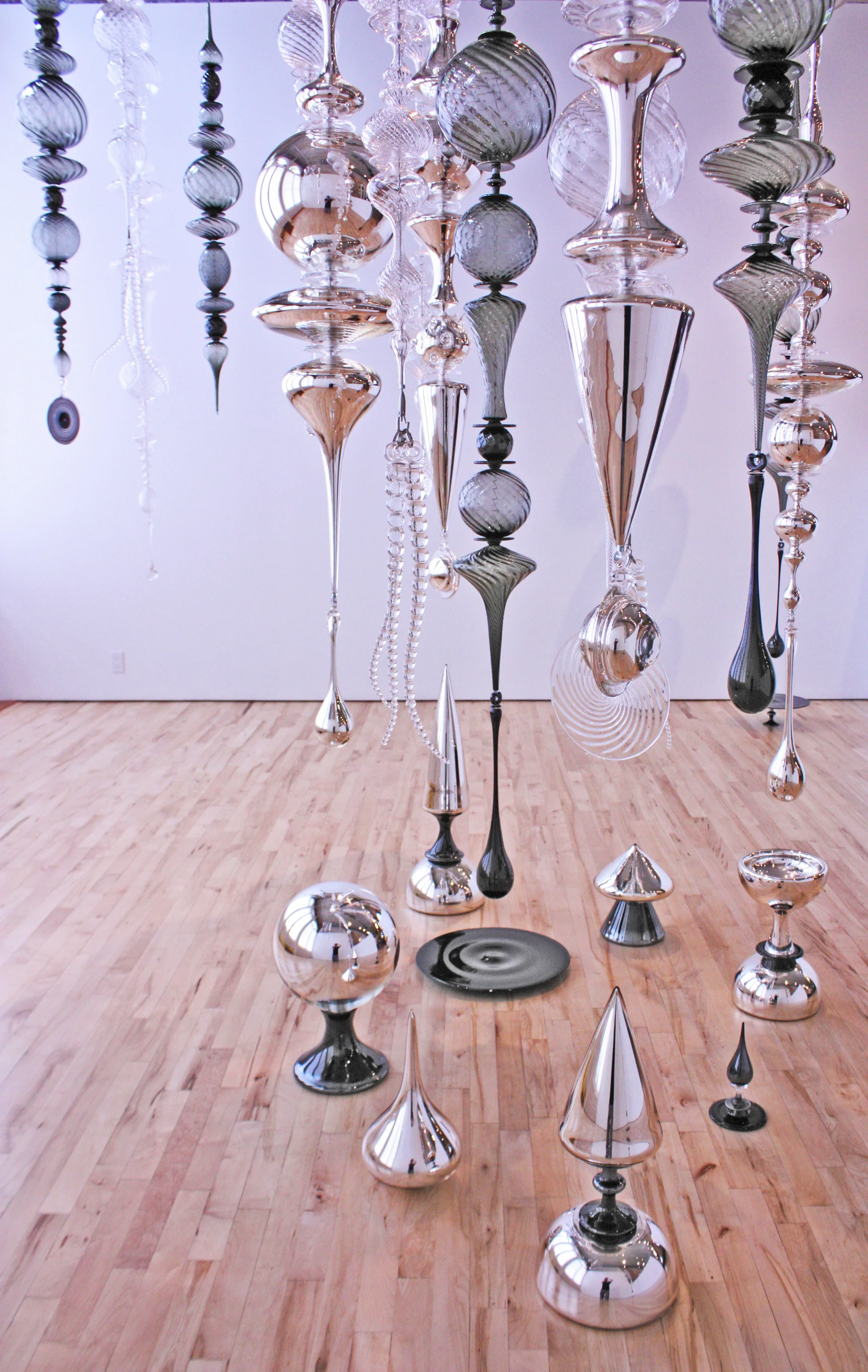 Blown, mirrored glass, acrylic, steel cable, hardware.